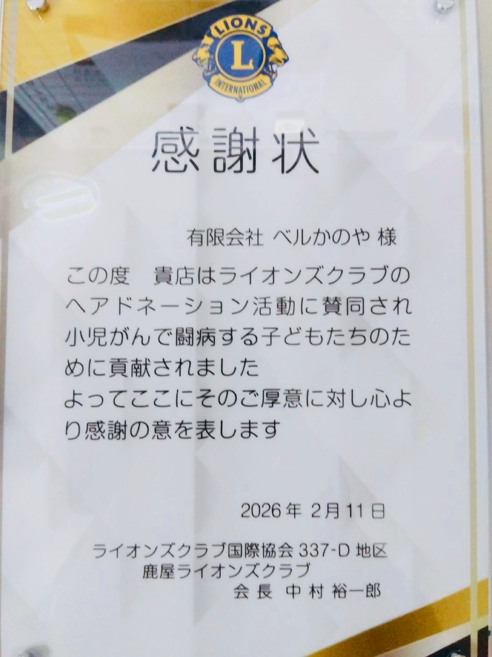 感謝状を頂きました